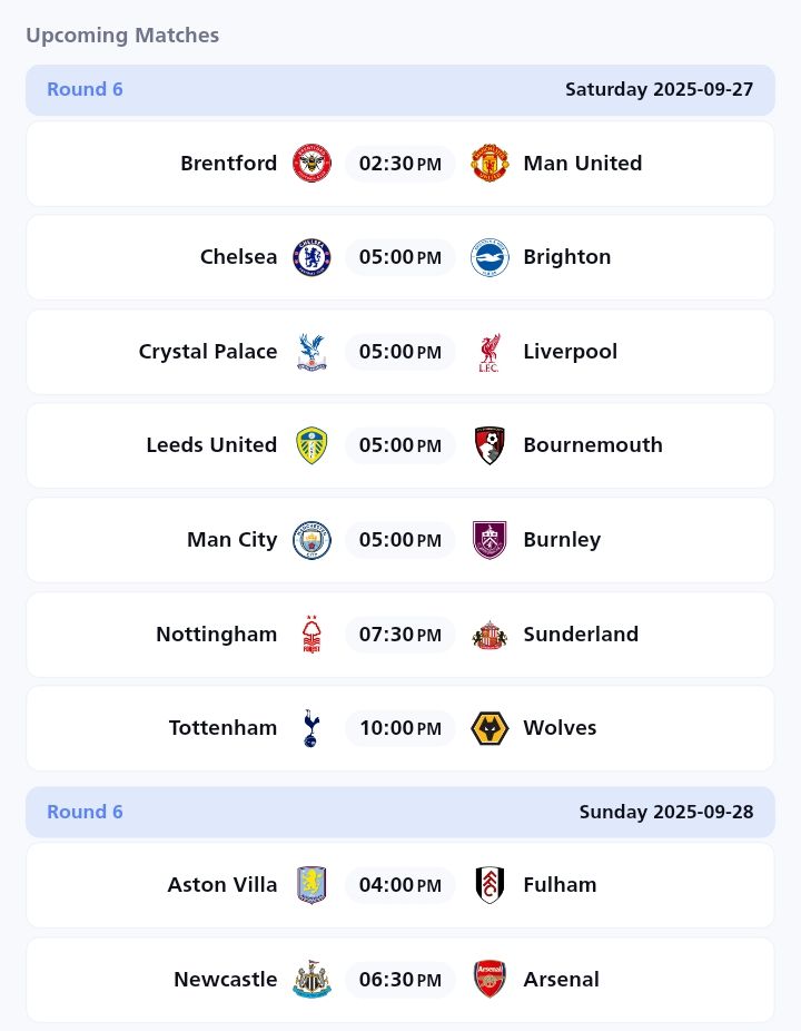 Newcastle United vs Arsenal (Sunday) — This could be a six‑pointer for those just behind the leaders; for Arsenal, a win consolidates top‑chasing hopes. For Newcastle, it’s a chance to close the gap and build confidence.